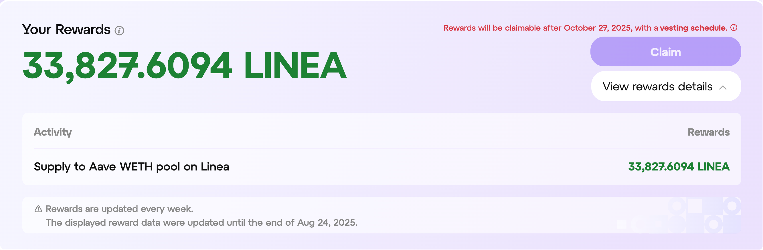 Note: All rewards earned in the Linea Ignition campaign are vested. 40% of your rewards can be immediately claimed after October 27, 2025. The remaining 60% rewards are unlocked linearly daily over the next 45 days after October 27, 2025.